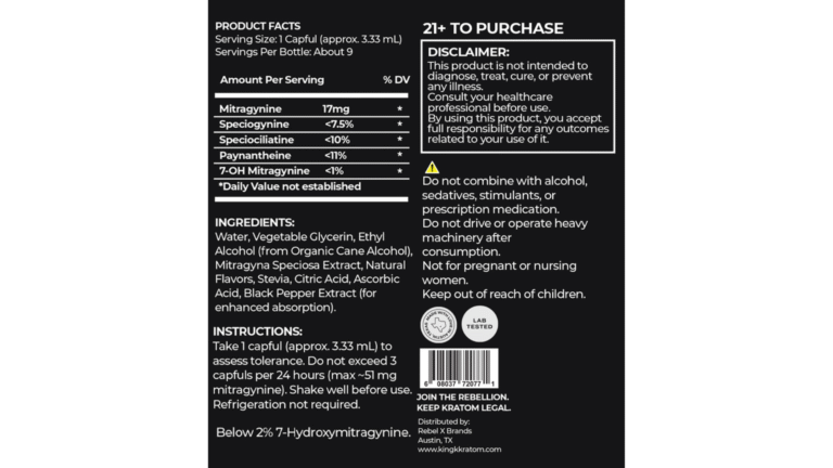 King K Silver Liquid Kratom Extract is meticulously produced using the finest Kratom leaves sourced from the lush forests of Indonesia, where the Mitragyna Speciosa tree thrives. Selected for their potency and quality, these leaves undergo a rigorous extraction process to guarantee maximum purity and effectiveness in every shot.